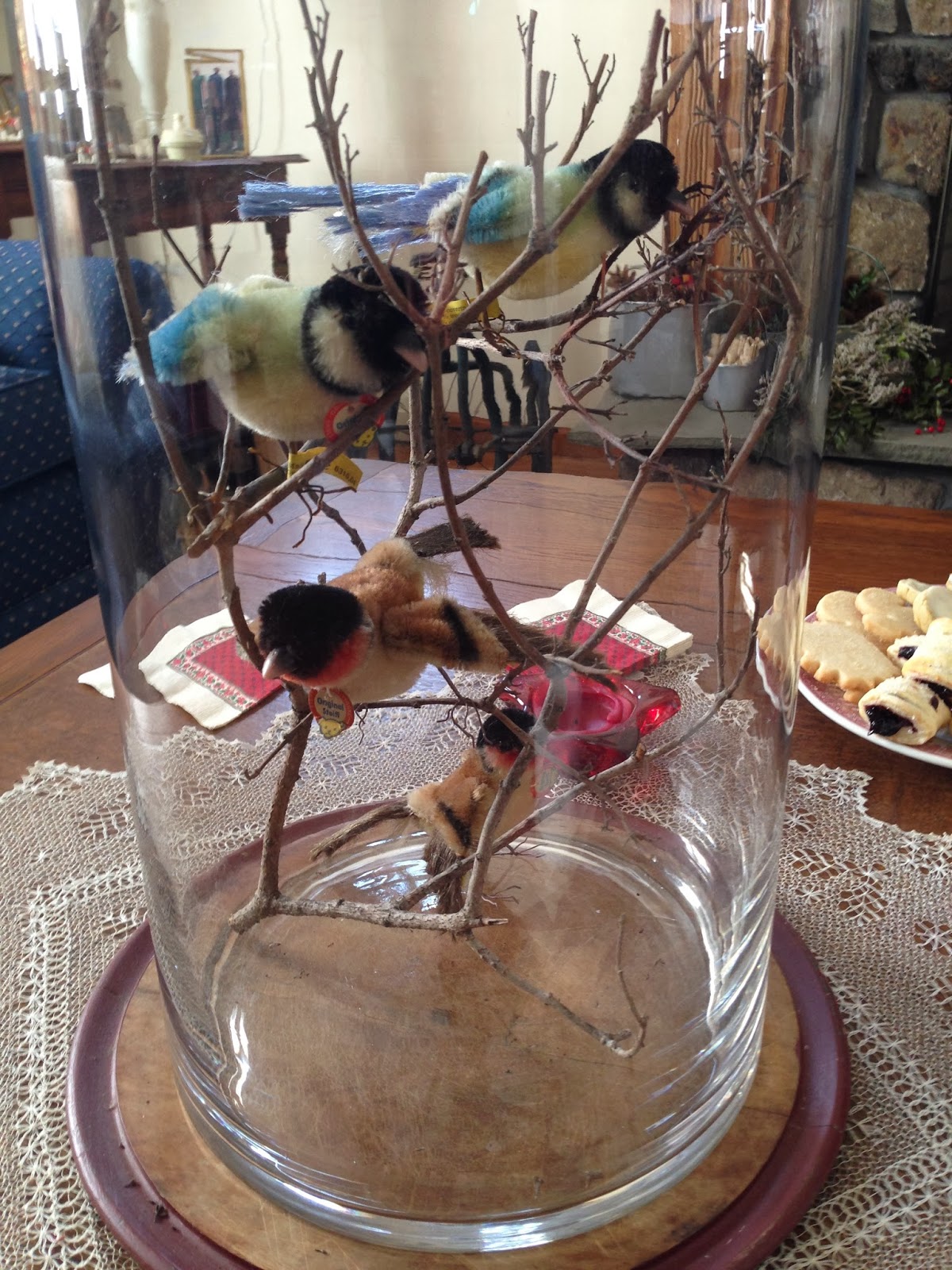 In addition to Sandy's great taste in Steiff, she also has a wonderful sense of how to display her collection. Take for example, this glass domed vignette of four early Steiff birds perched on just the perfect branch. Two of the birds are Finches, while the other two are Blue Tits. The birds are all 10 cm, made from mohair, with stiffened braided hair wing tips, plastic beaks, and early metal feet. Both the Finches and the Blue Tits were produced in this size from 1959 through 1961.